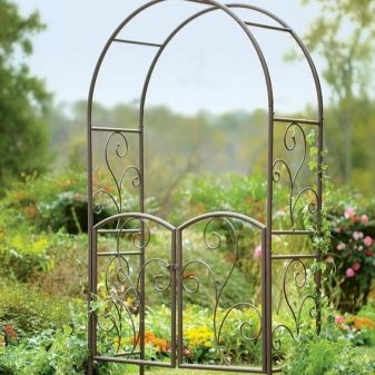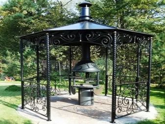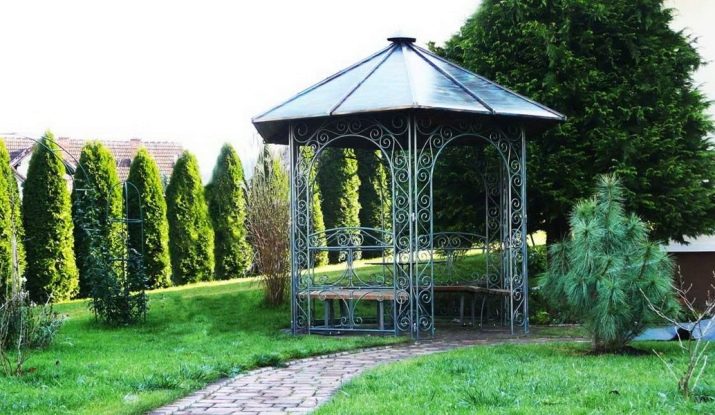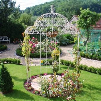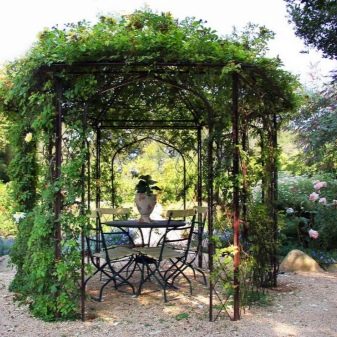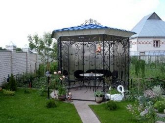 Ако метална конструкция е сред цветята, тогава нейните форми трябва да са меки и богато украсени., дантела и къдрици в този случай ще бъдат много полезни. За тези беседки, които са със значителен размер и ще служат не само като място за почивка, но и като място за барбекю и барбекю, а може би и детска площадка, трябва да използвате нещо универсално, стилно и красиво. Геометричните форми, линиите със строга и правилна форма ще изглеждат най -добре в този случай..