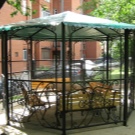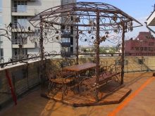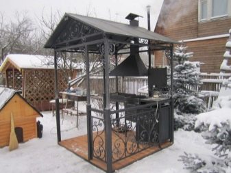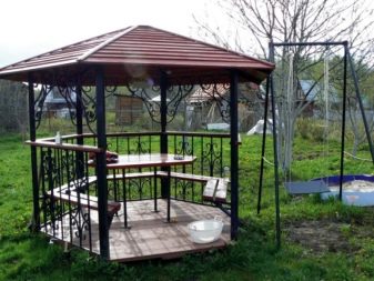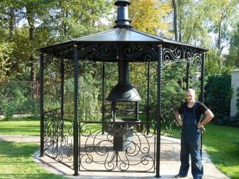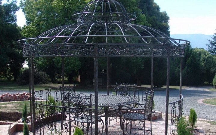 - метална беседка върви добре с дървени мебели или плетени опции, каменна печка или метален мангал изглежда подходящо и красиво;