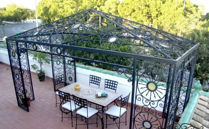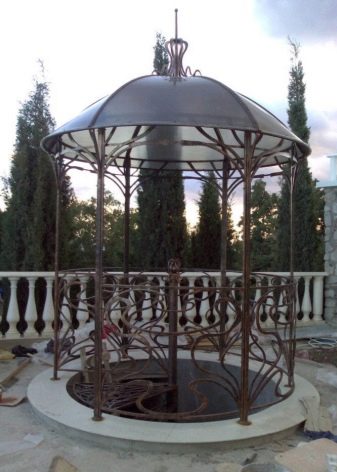 Няма толкова много недостатъци и можете да се справите с тях, ако следвате и се грижите за продукта и го поставяте на сянка. Голямото предимство на металните изделия е възможността да се създават истински шедьоври. Сградата ще бъде индивидуална и изключителна, което е трудно постижимо от дърво или други материали. Работният процес може да се извърши с помощта на два вида коване: горещо и студено. Първият вариант ви позволява да постигнете уникални резултати и да направите нещо изискано и красиво, но такава работа ще струва много повече. Студеното коване е по -евтино, но продуктите са по -малко деликатни и леки..