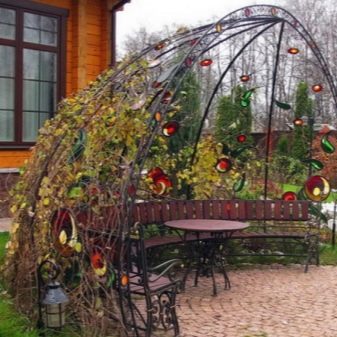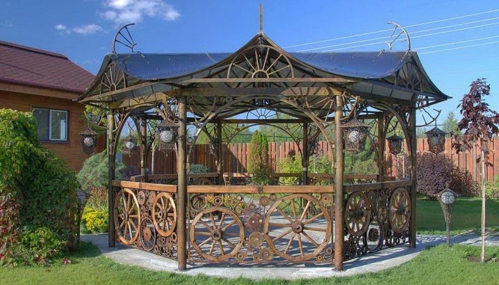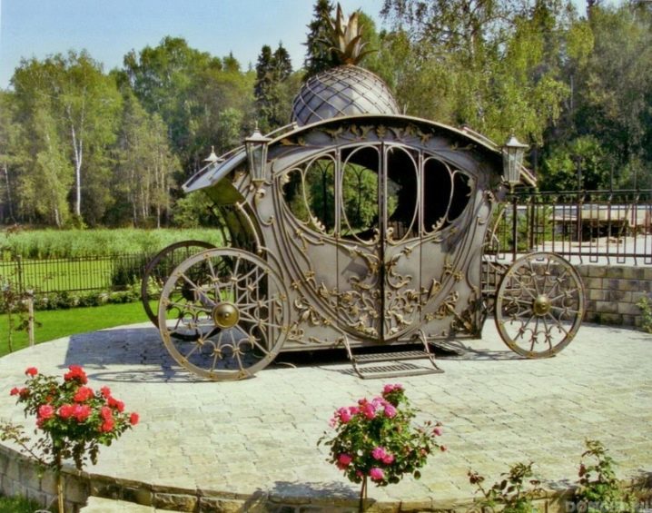 Ако има възможност да направите нещо специално, тогава изключителни беседки под формата на карета, вълшебна тиква или нещо подобно ще изглеждат невероятно на сайта, а децата ще харесат тази област най -много. В допълнение към използването на самия метал, можете да допълвате структурата с дърво и камък, за да направите сградата да изглежда по -солидна, здрава и издръжлива. Беседка, използваща естествени материали, ще продължи дълго време и ще зарадва очите на собствениците, въпреки че ще са необходими допълнителни усилия по отношение на грижите. Ако добавите пластмаса или подобни елементи към коването, тогава външният вид няма да бъде толкова стилен и скъп, но ще бъде много лесно да се грижите за структурата.