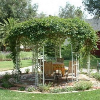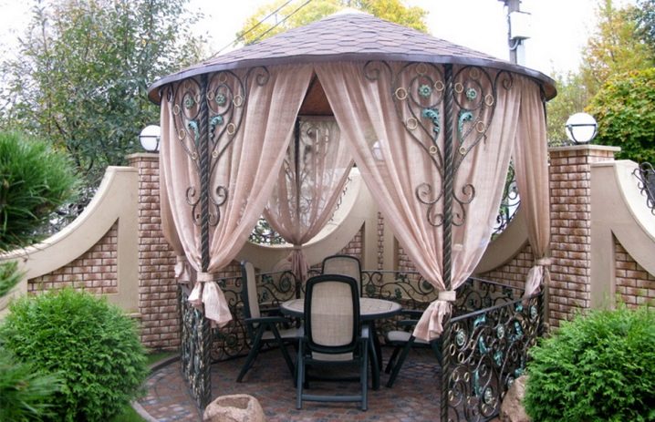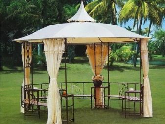 Използването на кръгла форма е идеално за малка площ, където искате да организирате красива и функционална зона. Облекчената версия на самата беседка под формата на стелажи и долната част на рамката с красиви елементи на художествено коване се компенсира от наличието на текстил отгоре. Тази техника ви позволява да направите сградата по -лека и по -ефирна, освен това, по -сложна. Но, от друга страна, винаги има възможност да се скриете от неприятен вятър или внезапен дъжд. Покривът на такава беседка често прилича на конус, но не твърде висок, не привлича вниманието към себе си, като същевременно е важна част от цялата беседка.