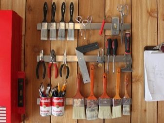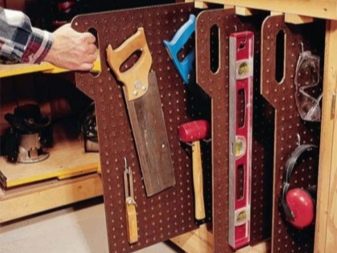 - Панели от шперплат за вертикално съхранение. Ако пробиете няколко различни отвора в обикновен шперплат, тогава можете да съхранявате инструменти в тях: отвертки, клещи, гаечни ключове и т.н..