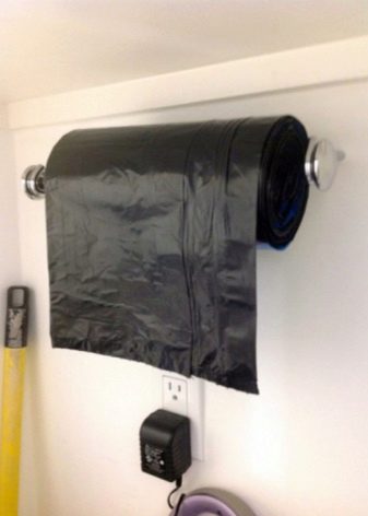 - Съхранение на торби за боклук. Има необичаен лайфхак за съхранение на торби за боклук. За да ги държите под ръка, можете да ги закачите на държач за хартиена кърпа. Това решение, което не е очевидно на пръв поглед, ще улесни процеса на почистване..