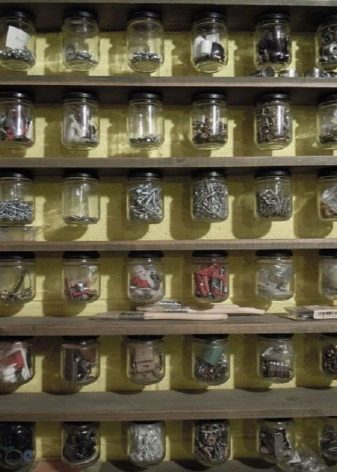 - Висящи банки. В допълнение към магнитния държач, можете да използвате и буркани с винтови капачки, за да съхранявате малките неща, които са ви необходими за работа. Капаците са прикрепени към дъното на рафтовете, а в самите кутии се поставят самонарезни винтове, пирони, винтове и др. Така контейнерите не заемат свободно място по рафтовете и в същото време , те все още остават свободно достъпни.