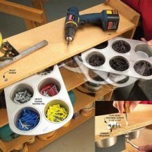 - Форми за кексчета. Друго неясно нещо, което може да се намери в гаража на креативен автомобилен ентусиаст, са формичките за кексчета. Тук те се използват не по предназначение, а всички за едно и също съхранение на малки гайки, крепежни елементи и винтове. Това е удобно, защото можете да поставите крепежни елементи с различни размери във всяка форма, като ги сортирате по този начин.