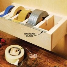 - Контейнер за колани. Електрическата лента е друго нещо, което винаги трябва да е под ръка. За да не се загуби нито един чилет, можете да съборите обикновен контейнер от дъските, за да ги съхранявате. Най -удобно е да поставите всяка лента в специално отделение..
