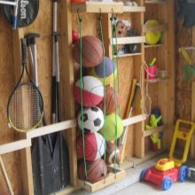 - Организиране на спортно оборудване. Тези, които водят активен начин на живот, също трябва да държат спортно оборудване у дома. За да предотвратите търкаляне на топките по целия гараж, можете да дърпате две здрави въжета с правилната ширина и да ги закрепите към пода и тавана. Оказва се домашно отделение за съхранение на аксесоари за футбол, баскетбол и волейбол. Топките няма да се изтъркулят от там, но можете да вземете тази, от която се нуждаете в момента, без никакви проблеми.