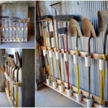 - Контейнери за тръби. По -големи инструменти като градински инструменти могат да се съхраняват в специално нарязани PVC тръби. За да създадете удобен и многофункционален контейнер, просто трябва да отрежете тръбата на няколко равни парчета и да ги фиксирате на стената. Няколко инструмента ще се поберат в една тръба, в зависимост от диаметъра.