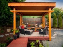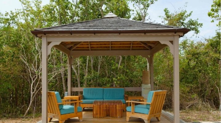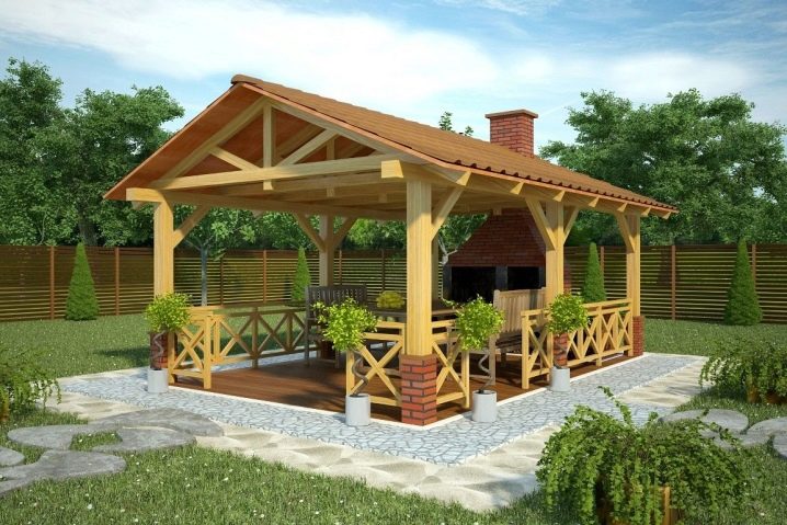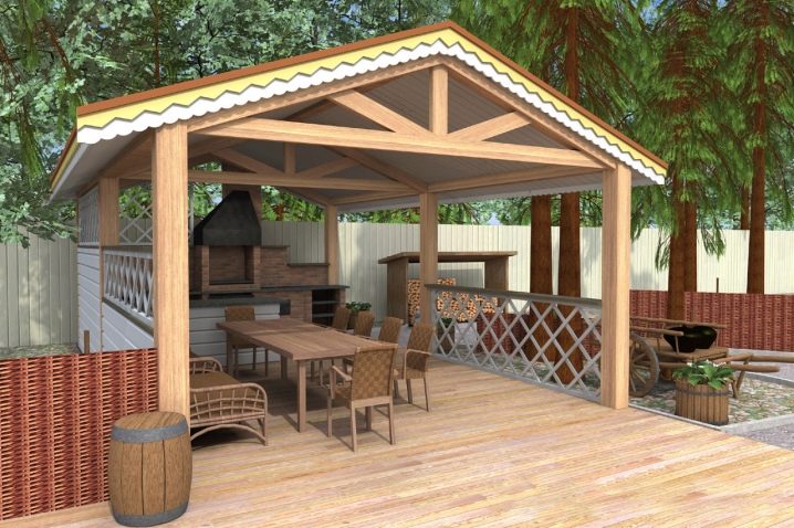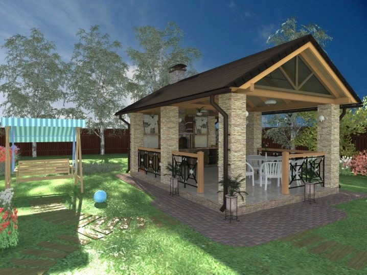 За лятната ваканция при топло време се нуждаете от обикновен балдахин без стени, прозорци и врати.. Надеждна сграда с барбекю, кухня и барбекю изисква използването на камък и тухла. Този дизайн ще даде възможност за удобна почивка по всяко време на годината за гости и членове на семейството..