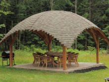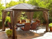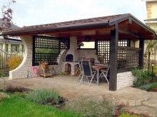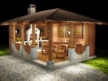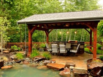 За лятната ваканция при топло време се нуждаете от обикновен балдахин без стени, прозорци и врати.. Надеждна сграда с барбекю, кухня и барбекю изисква използването на камък и тухла. Този дизайн ще даде възможност за удобна почивка по всяко време на годината за гости и членове на семейството..