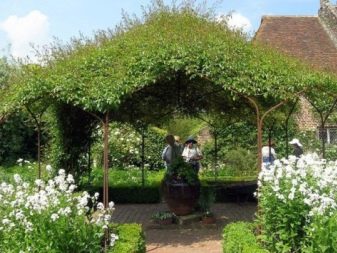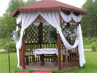 За украса на отворени беседки се използват тъкани и катерещи растения, създаващи декоративен плет.