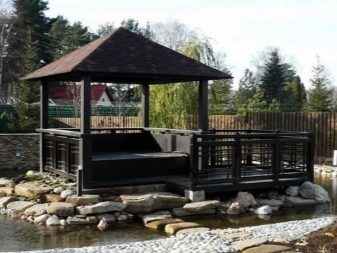 - Отворена беседка от тъмно дърво на брега на изкуствен резервоар ще ви даде възможност да се любувате на водната повърхност по всяко време на годината и ще се превърне в любимо място за почивка от шума и суетата на града..