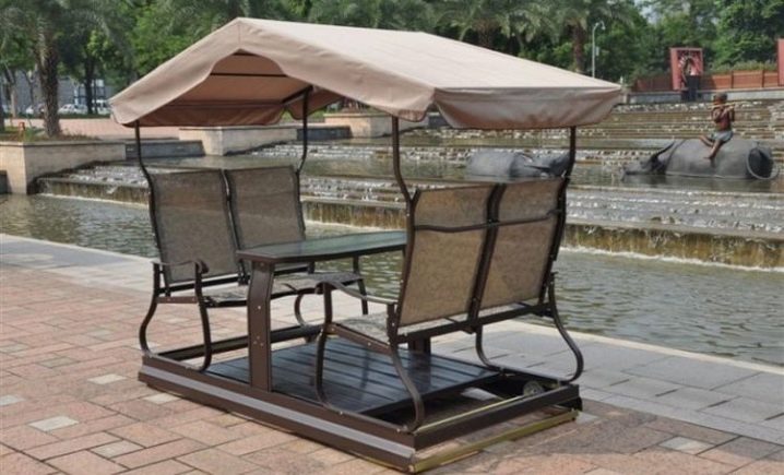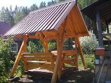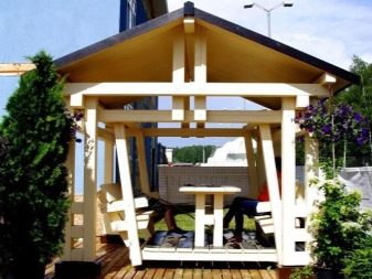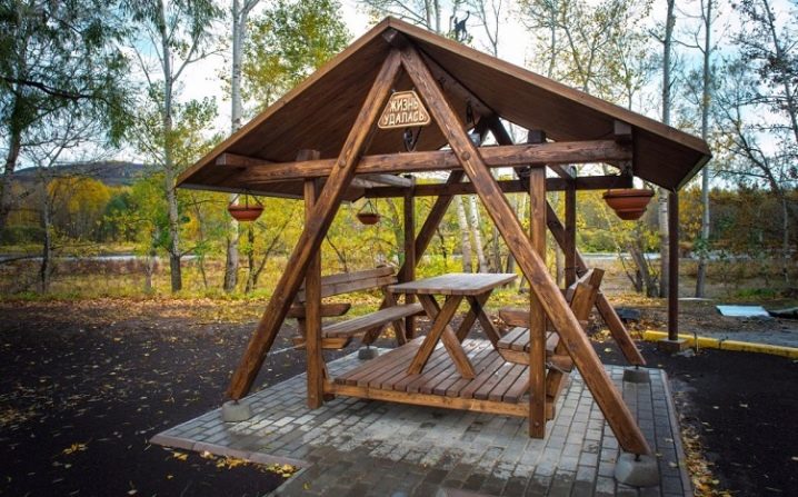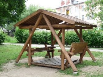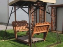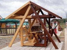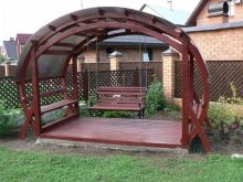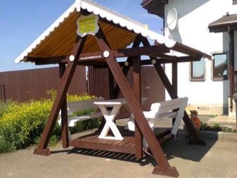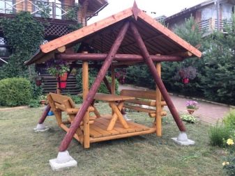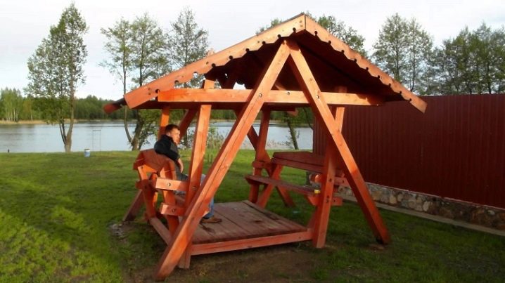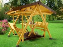 Самата седалка е изработена от дърво с необходимия вид и форма. Препоръчително е да изберете форма за масата и седалките от същата порода. Фиксираме всички продукти на подовата настилка и ги закачаме вътре в металната рамка. Тази рамка лесно издържа теглото на дървената конструкция. Покривът е направен от същия материал като основната конструкция или алтернативно от поликарбонат.