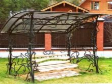 Такива конструкции са направени от два от най -търсените материали. Опорите са направени от метални профили или тръби. Препоръчително е също да направите рамка за стена от метал. Външният вид, направен от пръти или тръби, изглежда строг и повтаря геометрични форми. Металните беседки изглеждат леки и ефирни.