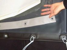 Можете да инсталирате крепежни елементи отдолу и отстрани. Ако платното е прикрепено само отгоре, тогава капсите могат да бъдат инсталирани отдолу. В случай, че не планирате напълно да демонтирате конструкцията, капсите ще ви помогнат да приберете материала и да го фиксирате на ролки, като използвате специални ленти..