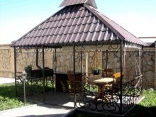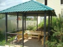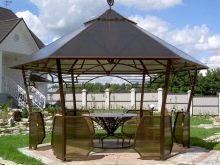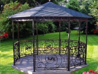 Осмоъгълната беседка, изработена от метал в дизайна на кутията, може да не се различава по никакъв начин от горното и може да бъде изящна, както е на снимката. Естествено, красотата ще изисква допълнителни усилия – поне собственикът трябва да може да използва заваръчна машина, както и да прави къдрави метални конструкции.