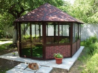 Затворените дизайни, иначе наричани отделни веранди, са опит да се премахнат недостатъците на предишния тип. Тук има стени. И така, долната част е изработена от ламарина, а прозорците обикновено са остъклени. Входът може да бъде под формата на празен отвор или пълноценна метална врата. Благодарение на интегралния контур, такава структура е защитена както от валежи, така и от вятър, поради което през лятото можете да останете тук при всяко време.