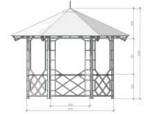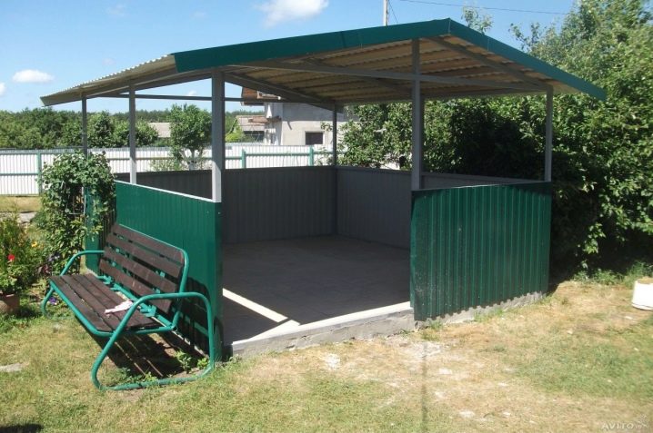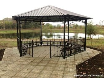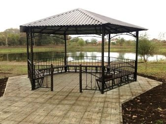 Покривът на метална беседка обикновено е направен от профилиран лист или друг вид ламарина. Ако дизайнът предполага наличието на стени, те са направени от един и същ материал..