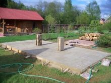 Във всеки случай, площта, отредена за строителство, първо трябва да бъде почистена от цялата растителност и след това да бъде изравнена. Горният слой почва с дебелина 10-15 см обикновено се отстранява, на нейно място, за по-голяма стабилност, можете да поставите тротоарни плочи (положени върху тънък слой пясък) или да излеете бетон.