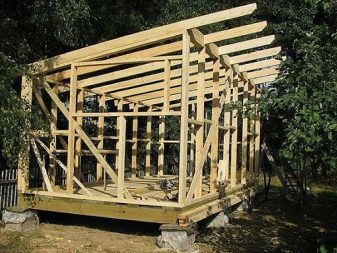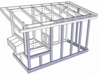 Следващата стъпка е изграждането на стени. Те са изградени под формата на дървени рамкови основи, а изолационният материал е фиксиран в останалите клетки между стелажите. След като сглобите рамката, можете да започнете да подреждате покрива на птицефермата. Първо, гредите се монтират чрез измерване на разстоянието на предните и задните стелажи, като се добавят около 30 см за надвеса. За кокошарника можете да изградите скатен покрив.