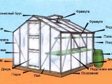 “Къща” се състои от две основни части: рамка и капак. Подпората е поддържана от издръжлив материал, който може да задържи не само покривалото на оранжерията, но и снега върху повърхността му. Стените и покривът на конструкцията трябва да са прозрачни.