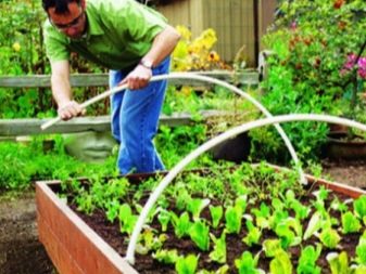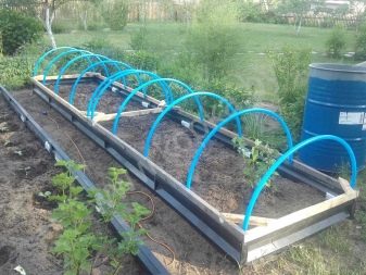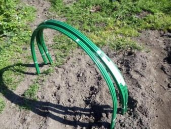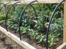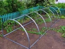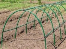 Оранжерията може да бъде изградена и от пластмасови арки, материалът за които ще бъде полипропиленов маркуч с дебели стени. Маркучът е разделен на равни части за арките. Ако е твърде мек, тогава в него трябва да се постави гъвкав проводник. След това те подготвят дървени или метални колчета и ги забиват в земята по дължината на леглото от двете страни с интервал от около 80 см. На тези колчета се поставят дъги.