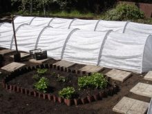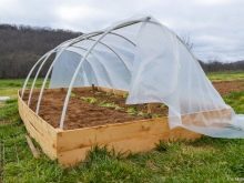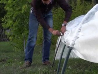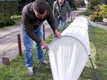 Дъгите се монтират на леглото, разстоянието между тях е 80 см, след това се изпъва нетъкан текстил, който се фиксира със скоби върху дъгите, ако е необходимо. От дъното по периметъра платното е фиксирано с камъни или дъски.
