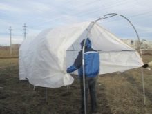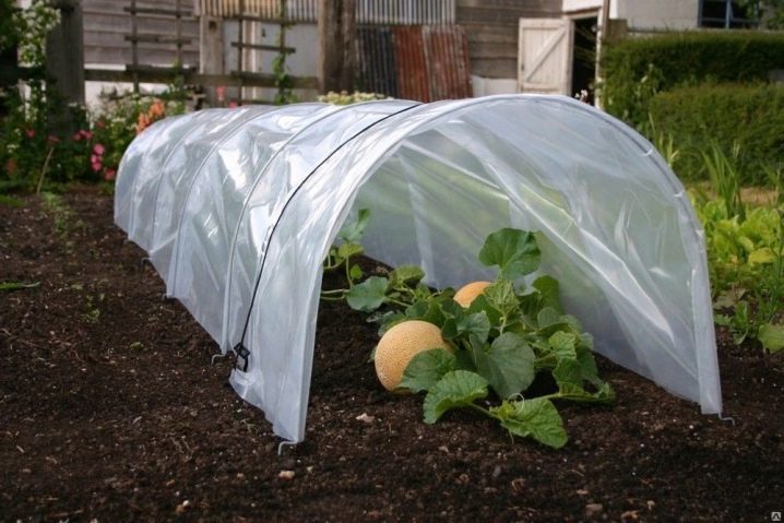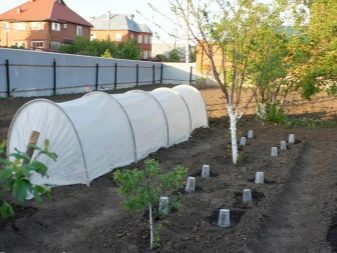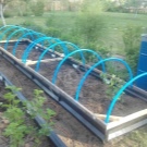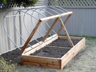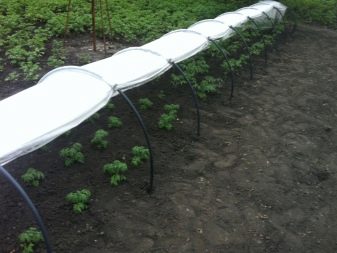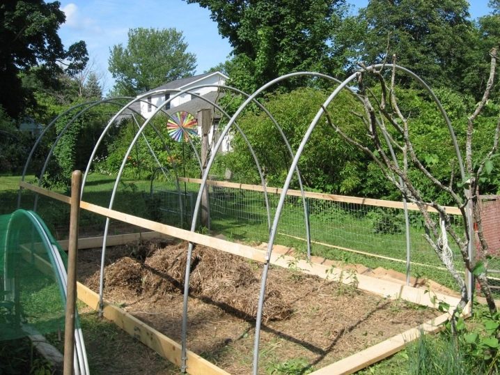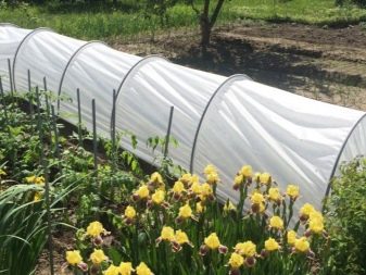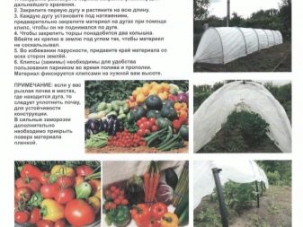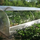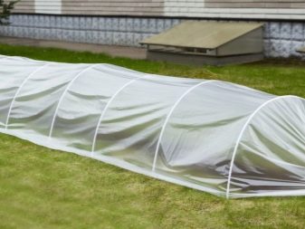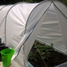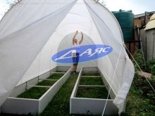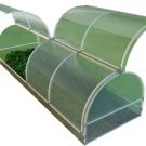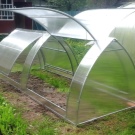 Иновативно решение за отглеждане на растения на открито. Предназначен за ранно засаждане на градинарски и градинарски култури. Този модел на оранжерия е в състояние да издържи на работа, когато атмосферните температури паднат до -5 градуса. Освен това в този случай плодовете няма да се страхуват от натоварване от вятър и атаки на вредни насекоми. Използването на агрофибър вместо филм значително улеснява процеса на вентилация. Полиетиленовите дъги не се страхуват от корозия, те са достатъчно леки, но в същото време здрави. Покривният материал е вграден в арките. Когато се монтира, сгънатата дъгообразна конструкция се разгъва и се фиксира в земята с помощта на заострени елементи в краищата на арките.