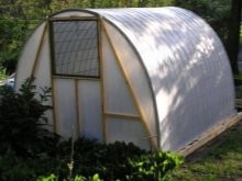 Ако говорим за просторна площ, посветена на сезонно отглеждане на градински растения, можете да изберете голяма и дълга версия с филмово покритие или поликарбонатен плот. В дълъг (5-8 м) заслон можете да отглеждате до 15-25 храсти домати или чушки, да събирате богата реколта от краставици. Компактна аркова оранжерия може лесно да бъде изградена и инсталирана във всяка област на обекта. Той е идеален за инсталиране в страната в сезона на покълване и втвърдяване на разсад, ще помогне да се реализират мечтите за разнообразие от отглеждани зеленчуци.