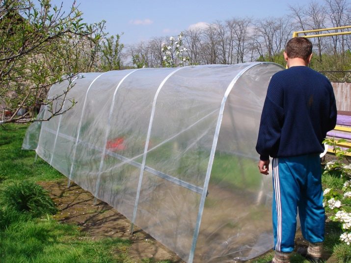 - Филм. Полиетиленовите конструкции по право се считат за най -атрактивни по отношение на достъпността. Годишната подмяна на външното покритие е евтина за летните жители, като същевременно осигурява отлични условия за отглеждане на разсад или закърнели култури. Класическият филм пропуска добре светлината, но не регулира интензивността на UV лъчението. Подсилените продукти са по -издръжливи и могат да издържат повече от два сезона. Друг недостатък на филмовото покритие е неговата непропускливост. Липсата на условия за циркулация на въздуха създава същия “парников ефект”, който води до натрупване на конденз вътре в оранжерията.