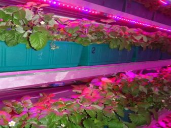 Ягодите се нуждаят от дългосрочно осветление. В този случай си струва да закупите лампи, които могат да светят дълго време, независимо от мрежовото напрежение. Някои градинари използват флуоресцентни, както и живачни лампи, за да ускорят плододаването. Те допринасят за увеличаване на фотосинтезата, имат положителен ефект върху растежа на културата и цвета на нейните листа..