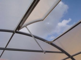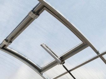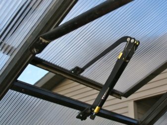 Въртящите се панти са една от опциите за закрепване на прозорци. Изборът на дизайна на фрагмента няма да повлияе по никакъв начин на микроклимата. Ако няма предварително изчисление на температурния режим, тогава те не правят рамка, поликарбонатът се нарязва от три страни и ръбът се счупва, който трябва да се движи свободно. На по -ниското ниво се създава усилващ елемент, като него можете да използвате релса или профил. Такъв дизайн може да помогне, докато не бъде организирана вентилационната система..