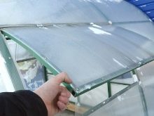 Особено внимание трябва да се обърне на качеството на фитингите, тъй като работата на вентилационните прозорци ще зависи от това. Фрагментът се поставя в рамката и пантите се монтират. Желателно е малка площ да бъде заварена на долния ръб, ръбът на механизма ще се побере тук. По рамката се правят проходни отвори. Те трябва да са на разстояние 15 сантиметра една от друга. Не забравяйте да имате отстъп от 5 см от ъглите. Рамката е прикрепена към рамката на оранжерията с помощта на самонарезни винтове с широка глава.