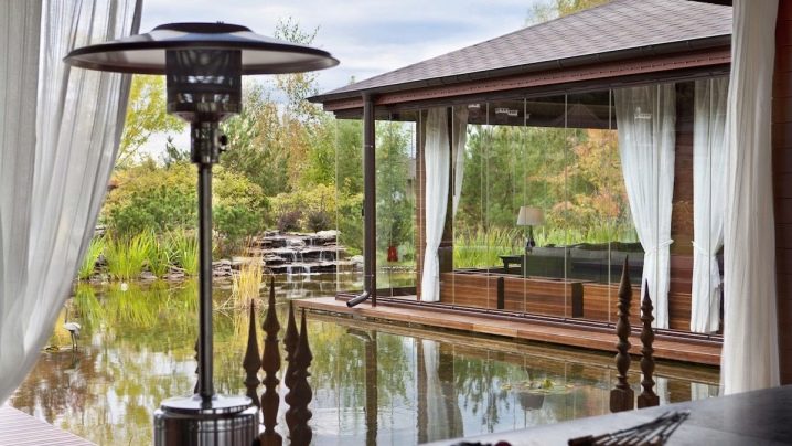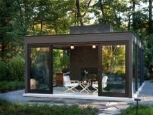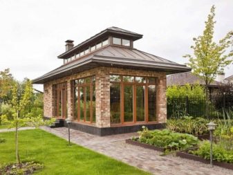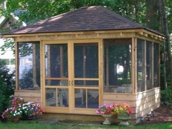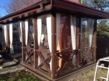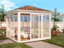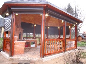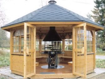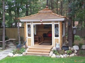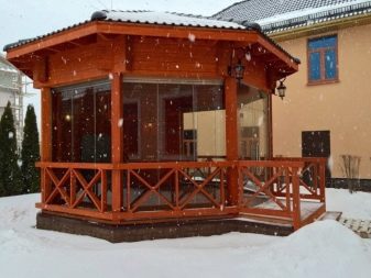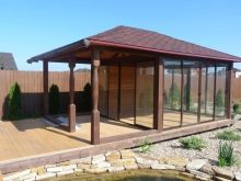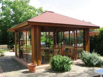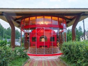 Например, ако е замислен като уединен ъгъл на градинския парцел на лятна вила, той се отстранява от любопитни очи, стъклото се прави малко. Такава беседка прилича на малка къща за гости. В същото време вътре може да има камина, комплект мека мебел и дори телевизор..
