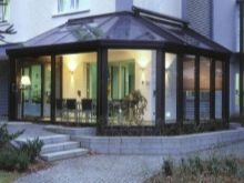 Внимателността на пейзажните характеристики ще позволи правилно да се впише в него дори лаконична версия на остъклена беседка. но желателно е материалът на нейната конструкция да съвпада с този, от който е направена къщата. Освен това е важно да се има предвид, че хармонията не предвижда различни стилистични решения..