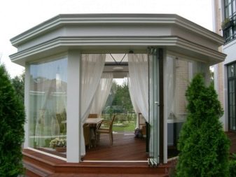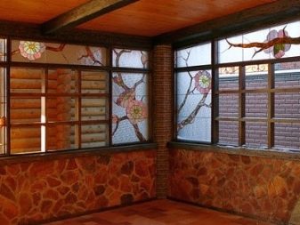 В зависимост от избрания стил, те могат да бъдат украсени не само със завеси, но и рафтове със свежи цветя. По -лесно е остъкляването на такива структури, тъй като тук по-често се използват прозорци с двоен стъклопакет.