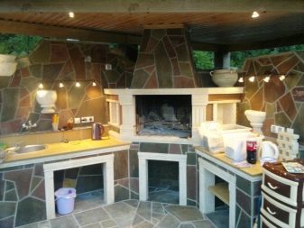 В зависимост от кадрите, можете да поставите цяла стена за готвене вътре, където ще се поберат казан, печка с печка на дърва, маса с плот и мивка. Такива проекти задължително предвиждат наличието на вентилационни системи..