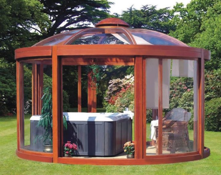 Поради формата, принципът на подреждане на мебели също се променя, което ви позволява да оборудвате беседката вътре в необикновеното. Полусферичните опции, от гледна точка на остъкляването, са по -трудни за изпълнение, но изглеждат и необичайни. Опитните майстори могат да направят такава структура, използвайки гъвкав поликарбонат и метална рамка..