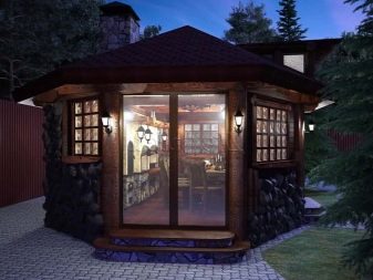 Най -добрият размер за този тип беседка е версията с дървени трупи 4х4 м с класически прозорци, облицовани стени, подове с плочки и камина. При правилен подход към строителството вариант със същите размери може да бъде направен и от камък и тухла.
