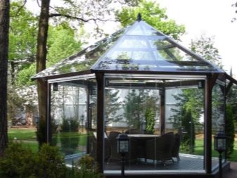 Такова остъкляване прави беседката възможно най -прозрачна, тъй като в нея са остъклени не само стените, но и покривът. За това се използват закалено стъкло и поликарбонат (за покрива). Такава сграда ще бъде надеждна и издръжлива..