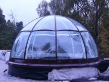 - Пример за беседка с предно остъкляване. Прозрачният покрив и стените правят конструкцията визуално безтегловна.