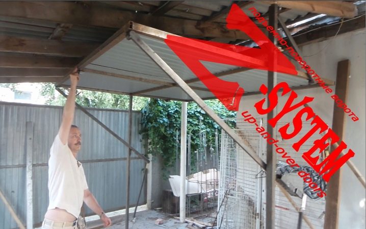 - Отварянето на крилата едновременно задвижва ролковия механизъм и повдигащите рамена. Поради това щитът започва да се движи в зависимост от това как са разположени водачите. Освен това платното е фиксирано отгоре успоредно на тавана, разположено сякаш от козирка.