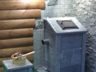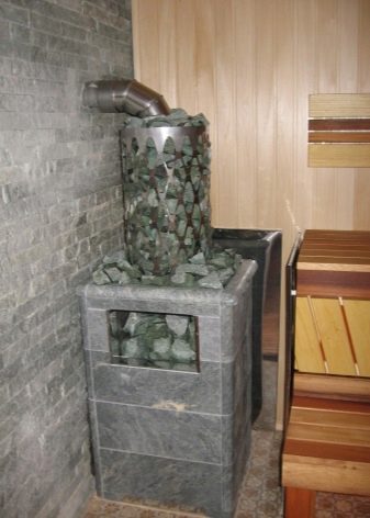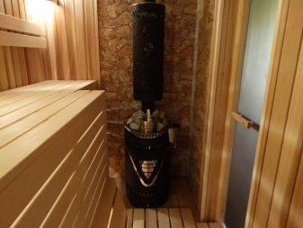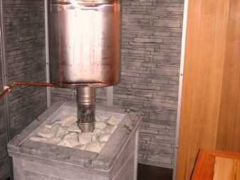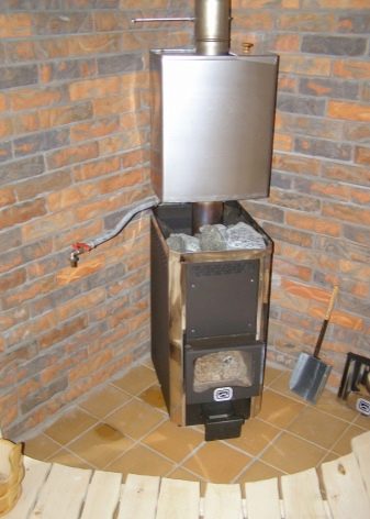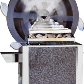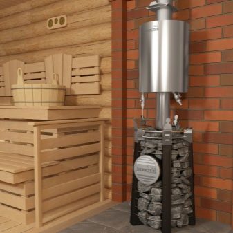 В печки на дърва с подобен дизайн камъните се намират във вътрешната част на тялото и са затворени с малък капак. В същото време горната част на уреда е оборудвана със специален термоустойчив контейнер за овкусяване. Течността преминава през капилярните системи и отива директно към горещите камъни.