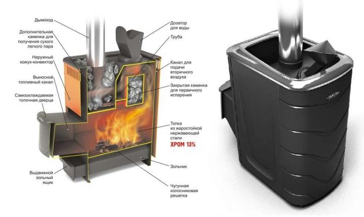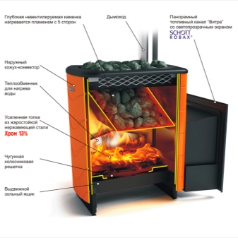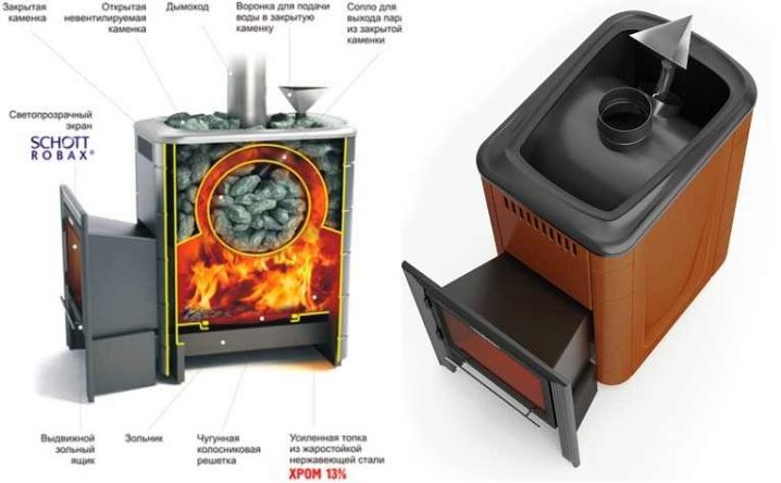 Печката за сауна може да изглежда като истинска камина с голяма чаша, която ви позволява да се любувате на пламъка от стаята за почивка. Производителят предлага устройства със затворен и отворен нагревател. При създаването на отоплителни устройства се използва топлоустойчива стомана, която се характеризира с повишена якост. Такива продукти не губят свойствата си с течение на времето, върху тях не се появява ръжда.. Парата се оказва здравословна, приятна, защото въздухът не изгаря в парната баня.