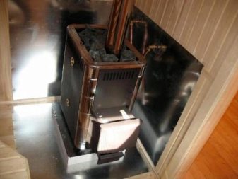 По -добре е да използвате поцинкован метал и в идеалния случай неръждаема стомана. Препоръчително е под металния лист да се поставят тухли (1-2 реда) и керамични плочки. Подът от печката няма да се затопли толкова, колкото стените, но все пак трябва да се осигури защита..