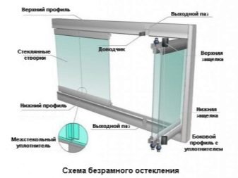 Остъкляването без рамки използва специална система за движение на крилото на прозореца, тъй като предполага стъклена стена. Крилото на прозореца се плъзга между профилите, което ви позволява да отворите целия отвор напълно, като по този начин се събирате до стената в една купчина. Стъклото е прикрепено директно към профила на прозореца без използване на вертикални държачи, създавайки панорамен изглед. Ако е необходимо, касетите на прозорците могат лесно да бъдат преместени настрани и безшумно да се плъзгат по ролковите водачи, или с помощта на люлеещия се механизъм може да се организира вентилация на помещението.