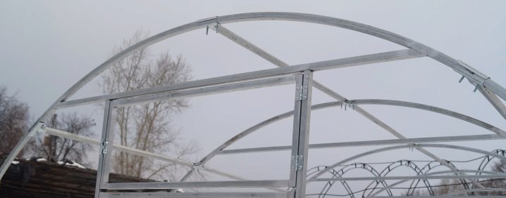- “Уралочка” е най -добрият вариант за градински и крайградски зони. Арматурата е изработена от стомана със сечение 20х20 милиметра. Всички метални части са боядисани с полимерна боя, която играе ролята на декорация. Времето за сглобяване е по -малко от два часа. Разстояние между дъги – 0,67 метра.