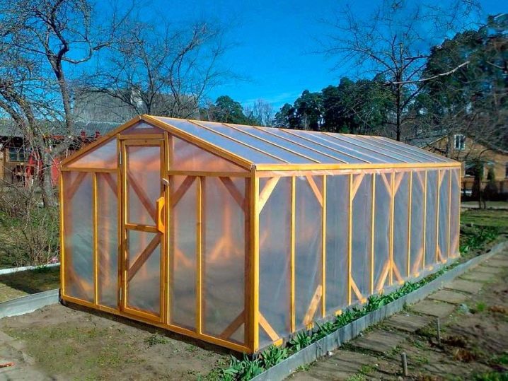 Подсилената оранжерия от поликарбонат за отглеждане на зеленчуци и плодове предпазва растенията от замръзване и ярко пролетно слънце. Той може да издържи на натиска на метров слой сняг и лед върху покрива и пориви на вятъра до 30 метра в секунда. Отличава се от проста конструкция с високата си якост и може да издържи натоварване от сняг до 820 кг / м². Арките на тавана са изработени от двоен метален ъгъл или двоен профил, зъбните колела в ъглите са закрепени с четири болта. Носещите елементи са с 1,2 милиметра по-дебели от тези на конвенционалната оранжерия. Поликарбонатните листове със стандартна или двойна дебелина са съответно четири или осем милиметра.