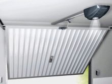 - Компактен размер. Самото крило на вратата не изисква допълнително пространство за отваряне пред гаража, за разлика от люлеещите се врати, например. Под тавана е необходимо допълнително пространство, но дори там е малко. По правило празнината, заделена за мрежата, не надвишава 20 cm.