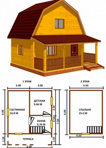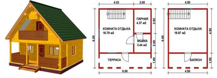 Банята може да бъде построена и на два етажа. Покривът му може да бъде от всякакъв вид. Често такива предмети се правят с покриви под формата на кула или бедро, които изглеждат доста оригинални на сайта. На втория етаж се правят стаи за нощувка, като там може да се постави и тераса..